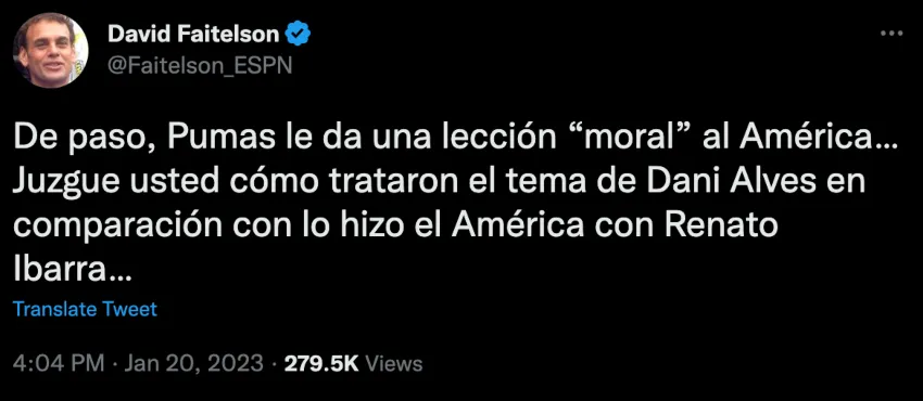 “De paso, Pumas le da una lección 'moral' al América… juzgue usted cómo trataron el tema de Dani Alves en comparación con lo que hizo el América con Renato Ibarra”, comenzó a explicar el analista de ESPN es su cuenta de Twitter.