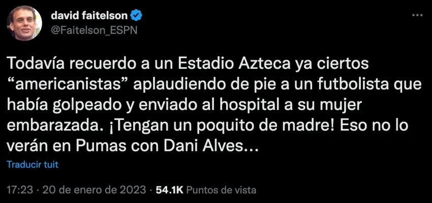 “Todavía recuerdo a un Estadio Azteca y a ciertos 'americanistas' aplaudiendo de pie a un futbolista que había golpeado y enviado al hospital a su mujer embarazada. ¡Tengan un poquito de madre! Eso no lo verán en Pumas con Dani Alves”.