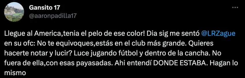 “Llegué al América, tenía el pelo de ese color. Día siguiente me sentó Zague en su oficina: 'No te equivoques, estás en el club más grande. ¿Quieres hacerte notar y lucir? Luce jugando futbol y dentro de la cancha, no fuera de ella con esas payasadas'. Ahí entendí dónde estaba. Hagan lo mismo”, señaló Gansito respondiendo a un tuit donde mostraba la foto de Israel Reyes y Nailea Vidrio con sus cabellos teñidos.
