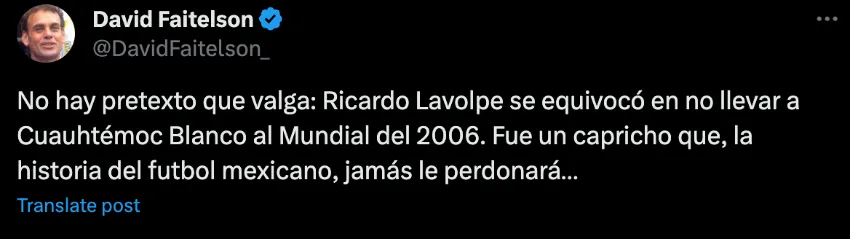 "No hay pretexto que valga: Ricardo Lavolpe se equivocó en no llevar a Cuauhtémoc Blanco al Mundial del 2006. Fue un capricho que, la historia del futbol mexicano, jamás lo perdonará", expresó Faitelson en su cuenta de X, antes Twitter.