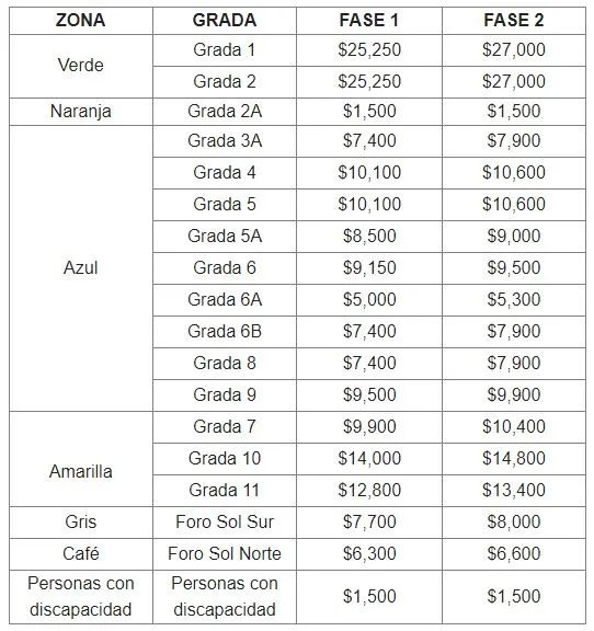 Los boletos están divididos en dos fases, en donde las entradas adquiridas en la preventa contemplan los precios de la primera fase, con un precio preferencial en comparación con la segunda.