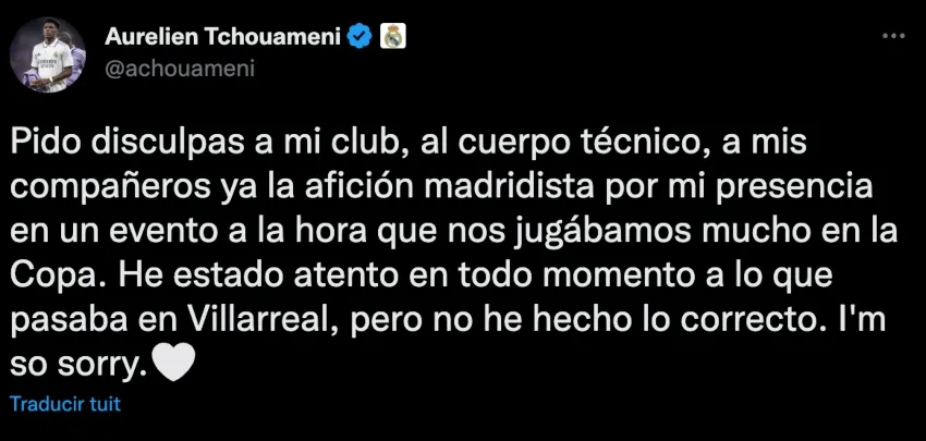 “Pido disculpas a mi club, al cuerpo técnico, a mis compañeros y a la afición madridista por mi presencia en un evento a la hora que nos jugábamos mucho en la Copa. He estado atento en todo momento a lo que pasaba en Villarreal, pero no he hecho lo correcto. Lo siento mucho”.