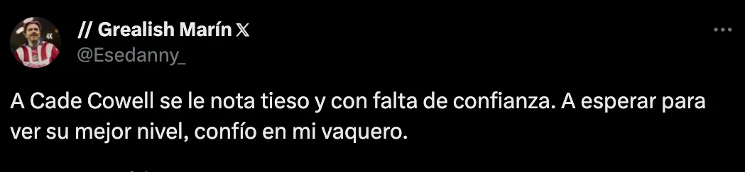 "Van pocos partidos, pero Cade Cowell no controla ni su respiración… todos los balones le rebotan", expresó un aficionado. "A Cade Cowell se le nota tieso y con falta de confianza. A esperar para ver su mejor nivel, confía en mi vaquero", expresó otro.