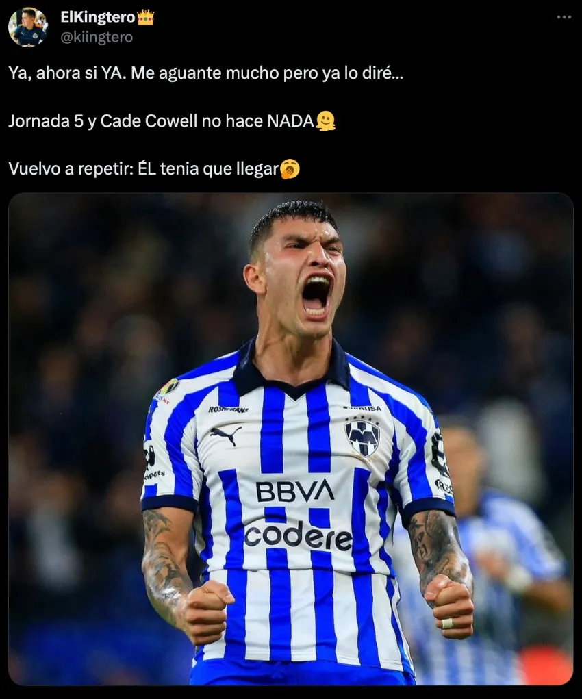 Un fanatico de Chivas más se inclinó por comparar a Cowell con Brandon Vázquez, el mexicoamericano que fichó Monterrey en este mismo Clausura 2024. "Ahora sí, ya. Me aguanté muchi, pero ya lo diré… Jornada 5 y Cade Cowell no hace nada. Vuelvo a repetir: Él tenía que llegar", señaló.