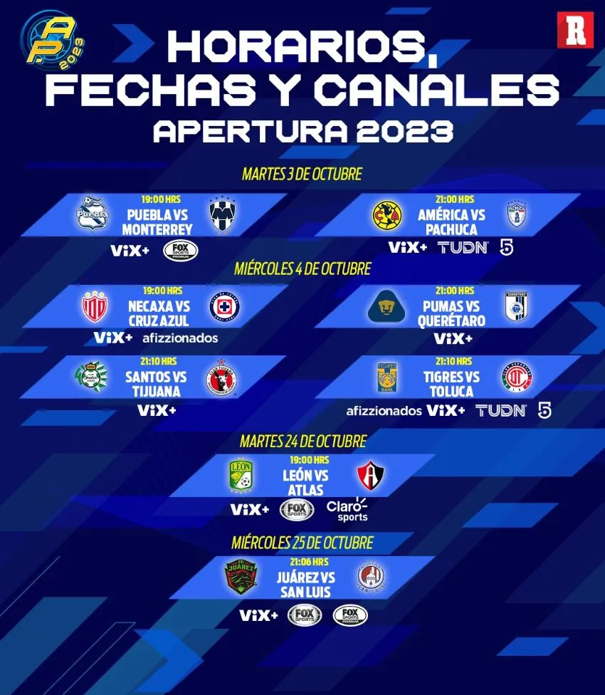 Por su parte, las dos sorpresas del AP23, Juárez y Atlético de San Luis también deberán esperar para poder enfrentarse, pues será hasta el miércoles 25 de octubre a las 21:06 horas por ViX+, Fox Sports y Fox Sports Premium.