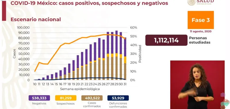 La Secretaría de Salud informó este martes 11 de agosto en la conferencia de prensa diaria que los casos de positivos de Covid-19 confirmados en México llegaron a la cifra de 492 mil 522, lo que representa un aumento de 6 mil 686 en el último día.