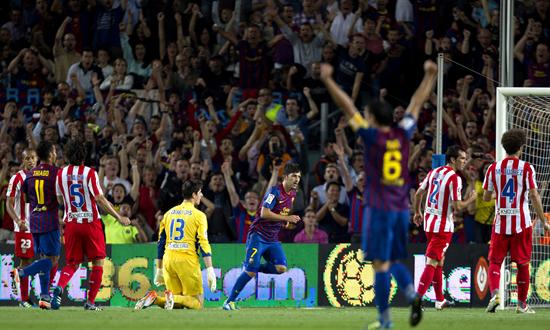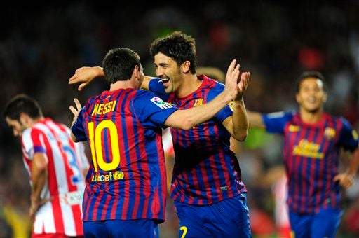 Messi y Villa celebran la goleada sobre el Atlético. (FOTO: AP)