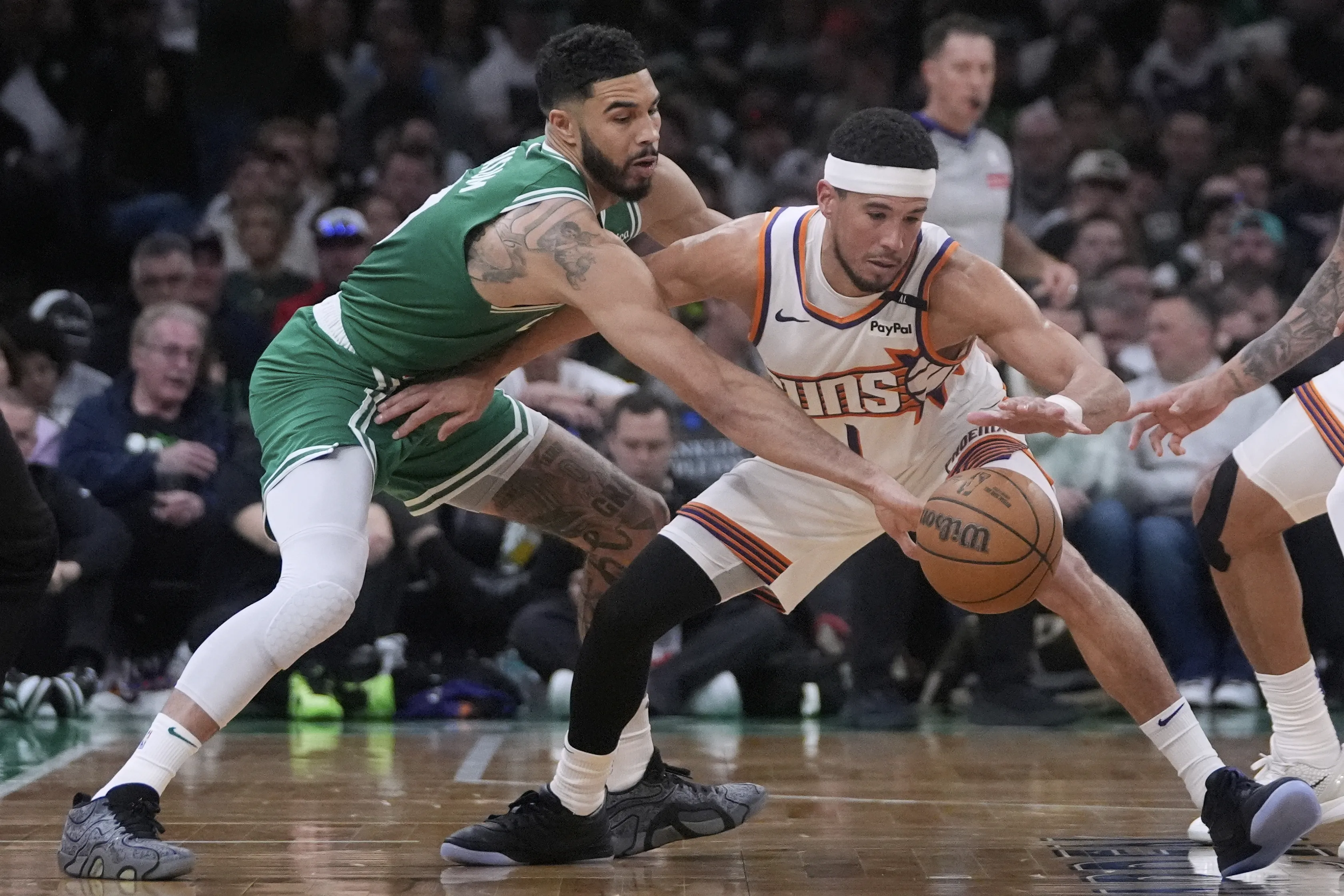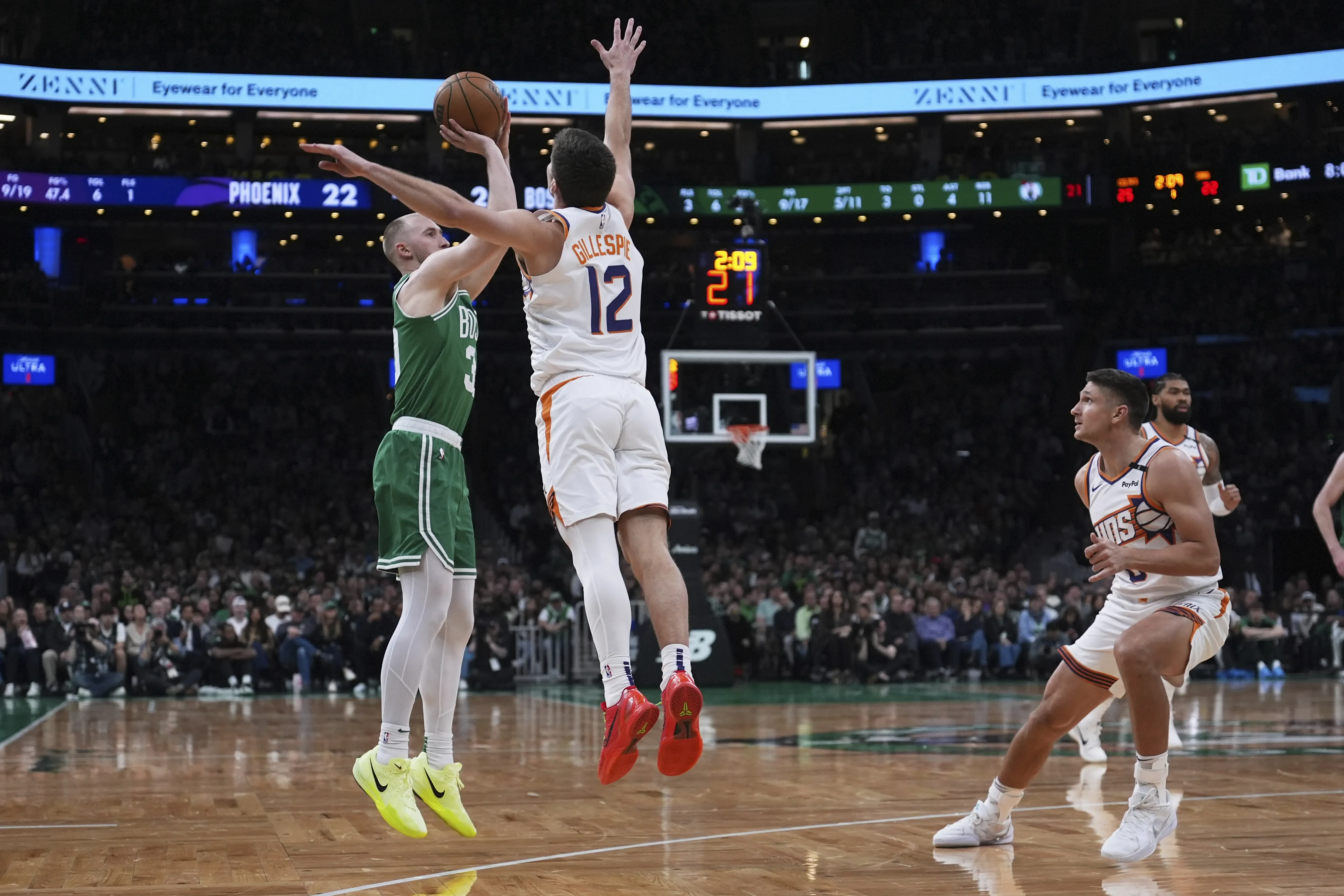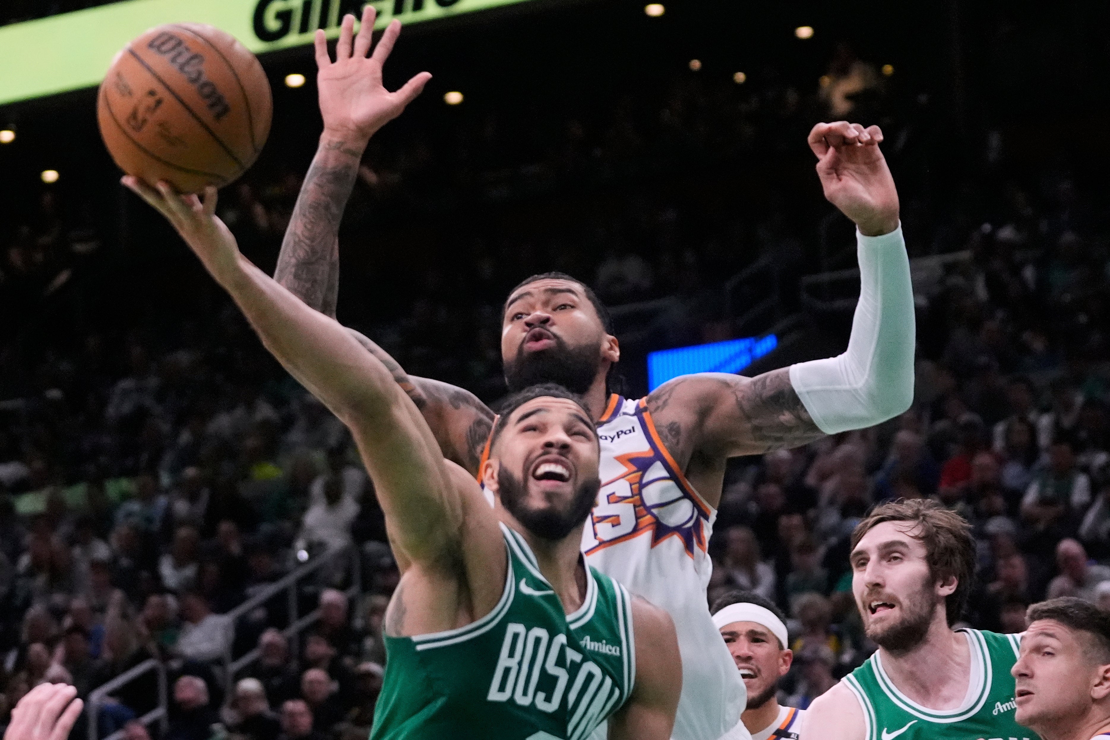 Jayson Tatum añadió 23 puntos, ocho rebotes y ocho asistencias. Kristaps Porzingis sumó 15 puntos antes de dirigirse al vestuario sosteniendo una toalla en el puente de la nariz al inicio del último cuarto, a raíz de un codazo de Cody Martin mientras el jugador de los Suns se dirigía a la canasta.
