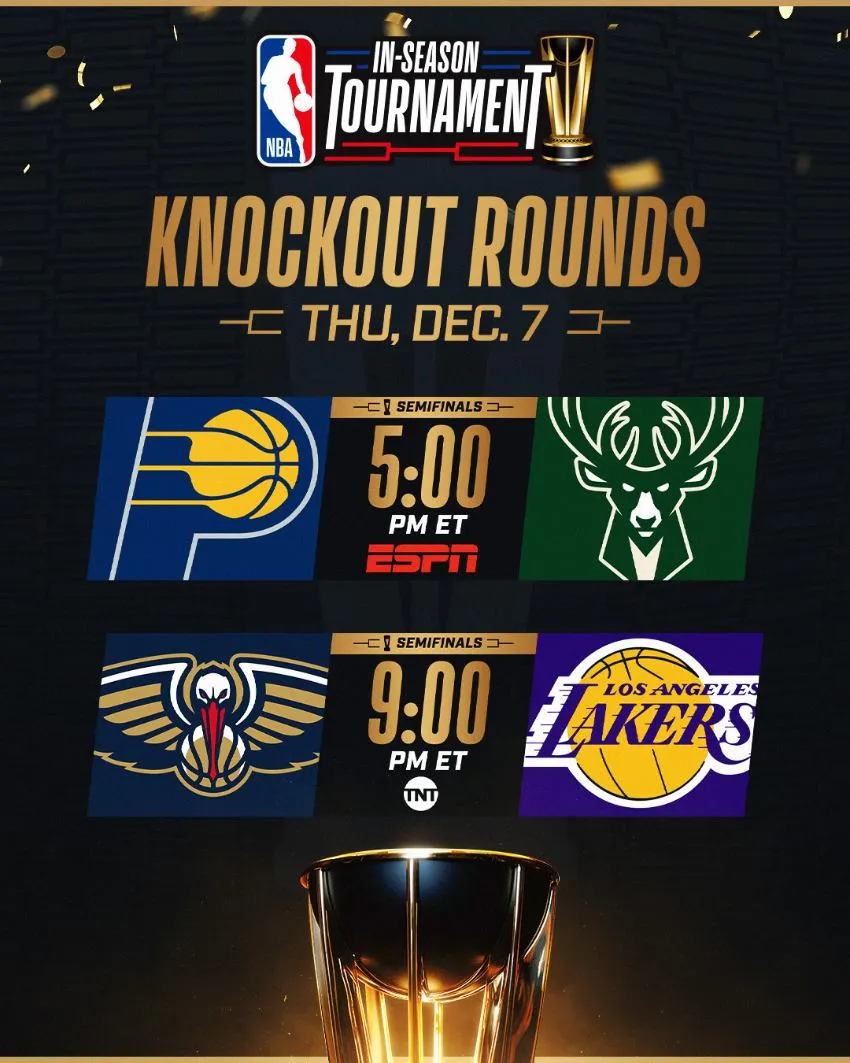 Quedaron definidas las primeras semifinales del In-Season Tournament de la NBA. Los Bucks se impusieron a los Knicks de Nueva York y se enfrentarán a los Pacers en la siguiente ronda; por su parte, los Lakers doblegaron a los Suns y se medirán a los Pelicans en la otra llave.
