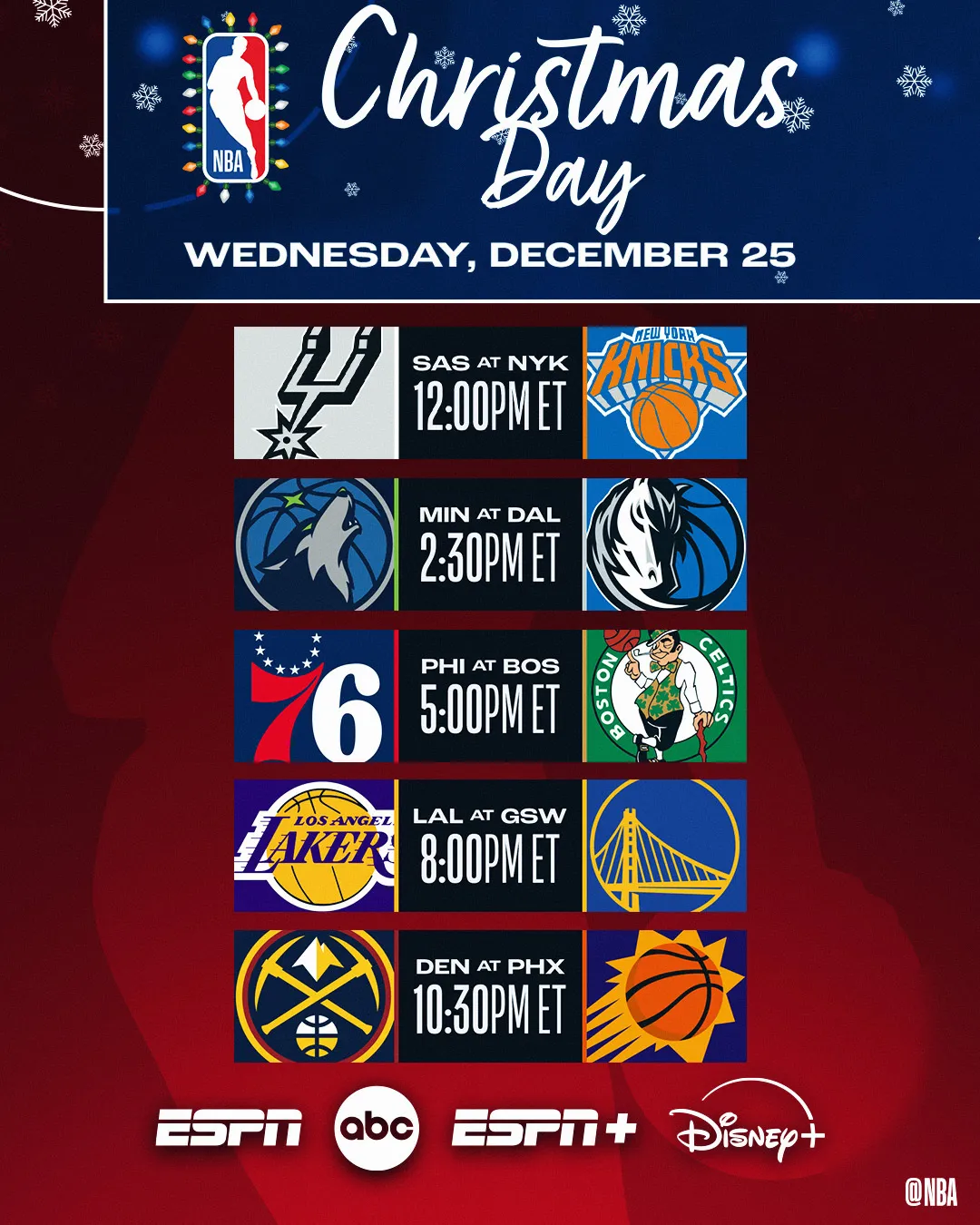 Los partidos de Navidad han sido vistos durante décadas como el momento en que más aficionados comienzan a ver baloncesto. La NFL, que competirá directamente contra la NBA este miércoles, se acerca al fin de la campaña regular, y los cinco duelos de la NBA se mostrarán a nivel nacional ya sea en ABC o ESPN.