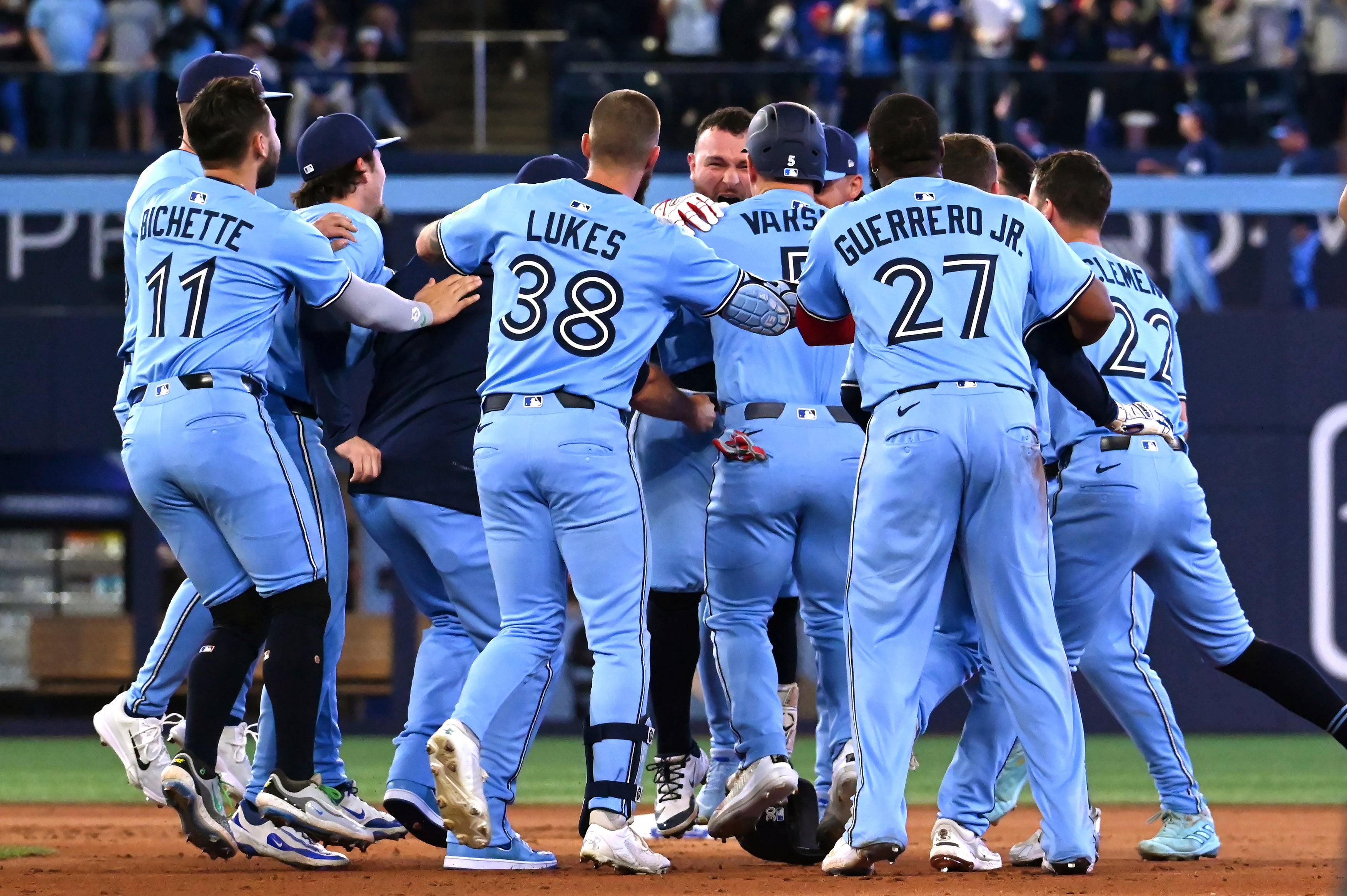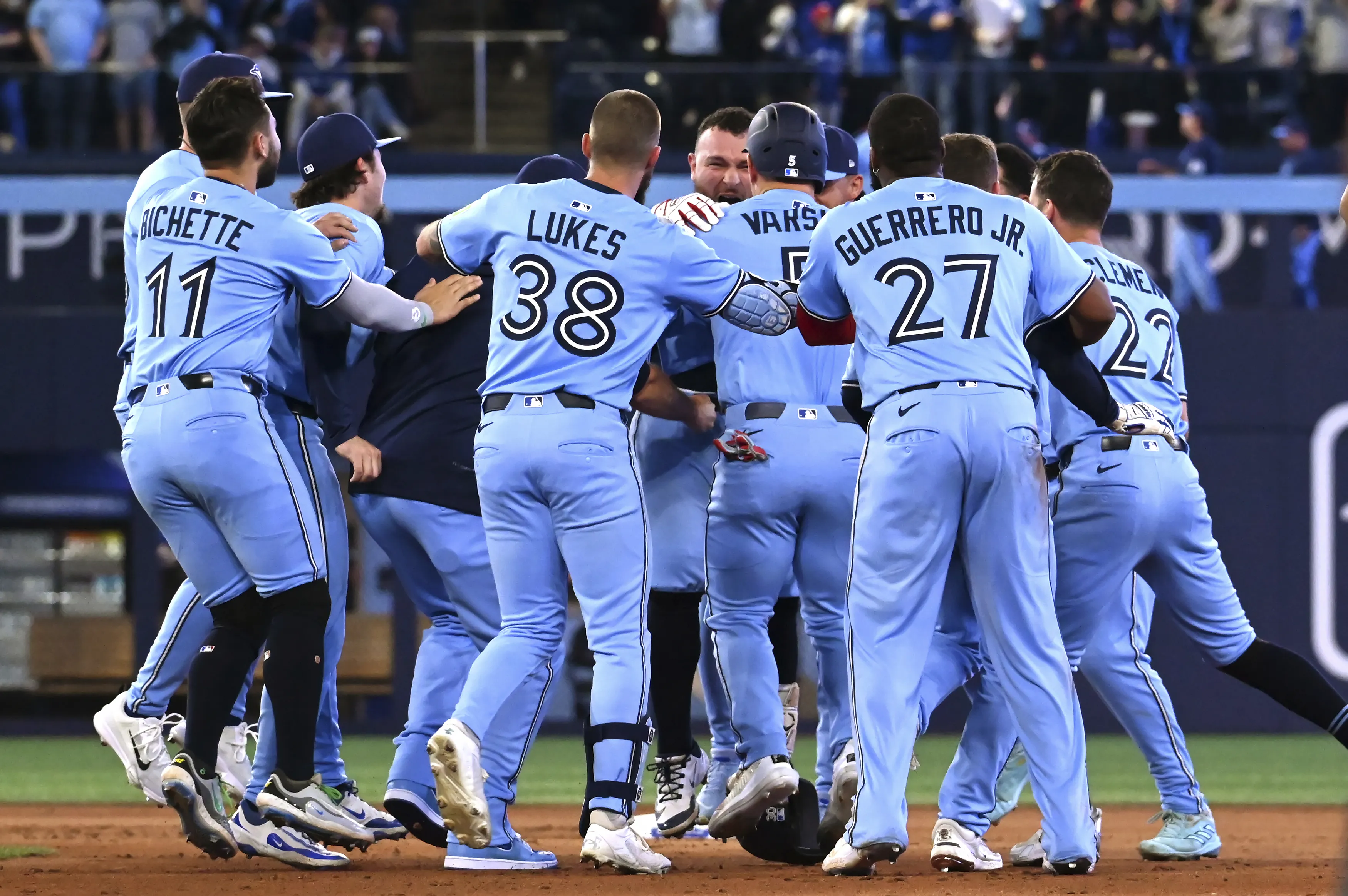 El dominicano Vladimir Guerrero Jr. comenzó la décima entrada como corredor automático en segunda, Justin Slaten (0-1) caminó intencionalmente a Daulton Varsho y a George Springer con un out.