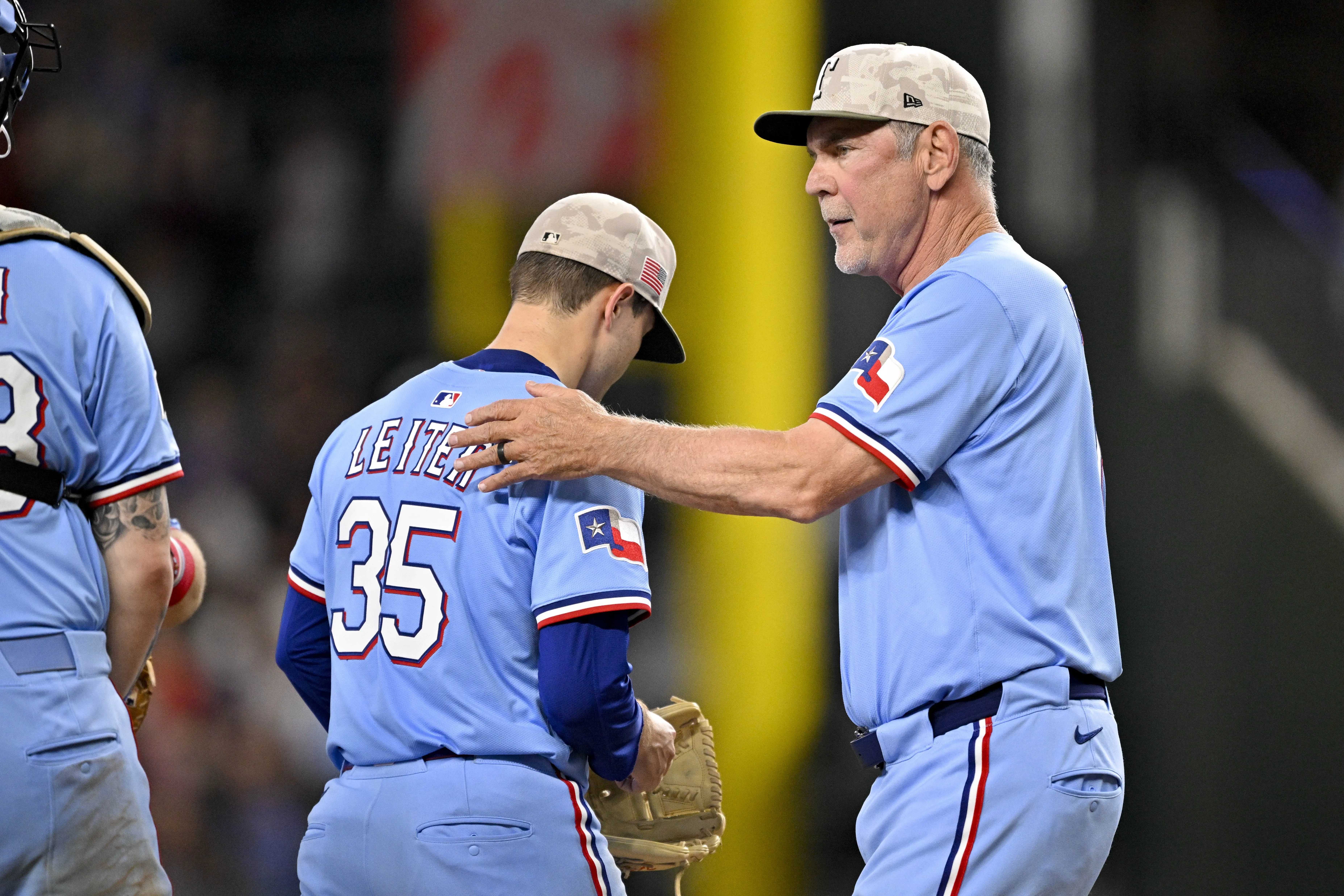 El relevista de Texas, Chris Martin, entró por Leiter, pero realizó solo un lanzamiento antes de salir con una aparente lesión.