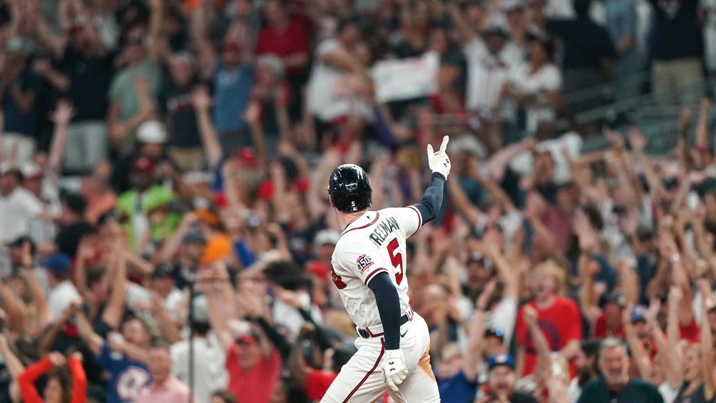 Freeman celebró salvajemente en su camino alrededor de las bases, y volvió a salir del dugout para una llamada de telón cuando la multitud de 40,195 rugió.