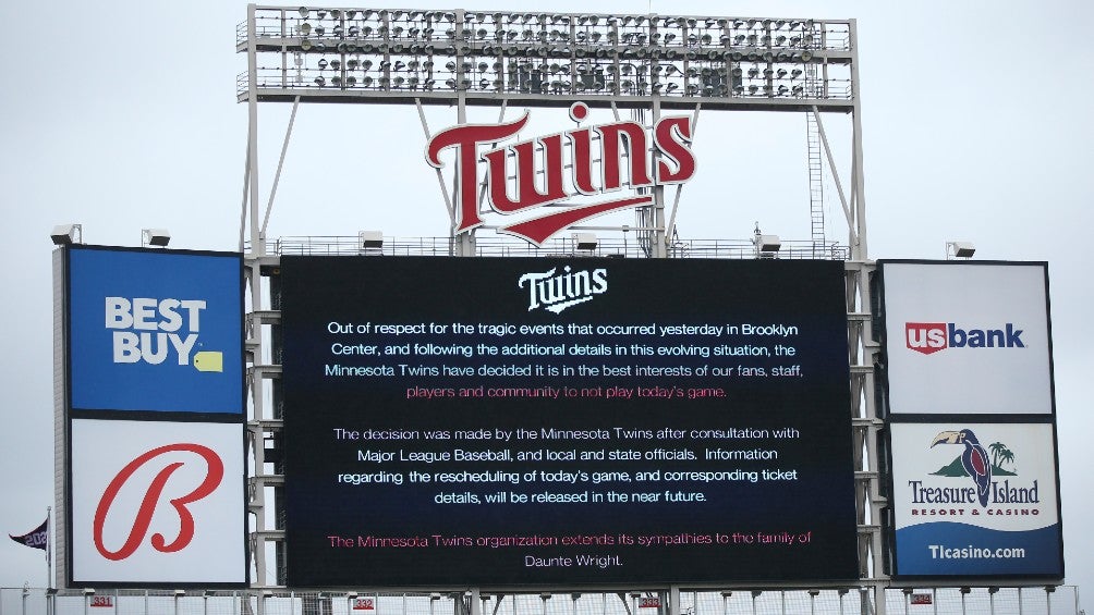 "En señal de respeto por los trágicos eventos ocurridos ayer en Brooklyn Center, y tras detalles adicionales en esta situación cambiante, los Mellizos de Minnesota que lo más prudente para nuestros aficionados, empleadores, jugadores y la comunidad era no disputar este juego", dijo el equipo en un comunicado. "La organización de los Mellizos de Minnesota extiende su pesar a la familia de Daunte Wright".