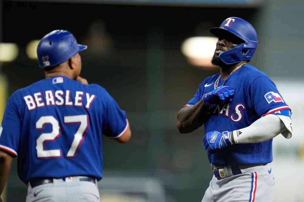 El partido se definió en el siguiente lanzamiento, con un cuadrangular de Adolis García por el jardín izquierdo. Leody Taveras, Marcus Semien y Corey Seager anotaron para poner el marcador 9-2, y prácticamente sellar el séptimo juego de la serie.