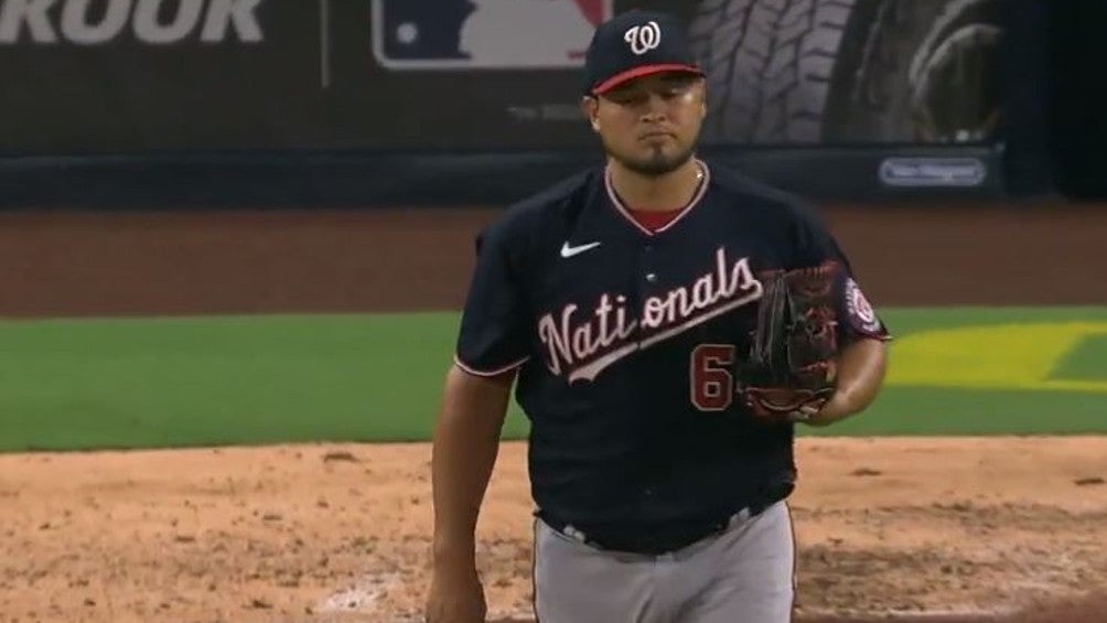 En la séptima entrada, con la casa llena, el veracruzano sacó dos outs por la vía del ponche; primero dictó sentencia a Trent Grishman y después al poderoso bate de Juan Soto quien arrojó su bate y casco al suelo, para apagar el fuego.