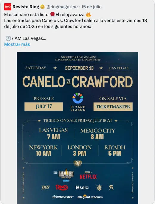 La venta de boletos para el público en general para la pelea Canelo Álvarez vs. Terence Crawford comienza este viernes 18 de julio a las 8:00 de la mañana hora del centro de la Ciudad de México a través de Ticketmaster. Los precios entran comienzan desde los $459 dólares en la parte más alta del estadio, mientras que en la parte más baja alcanzan los $9,609 dólares, sin contar ring side, los cuales podrían superar los $15 mil dólares.