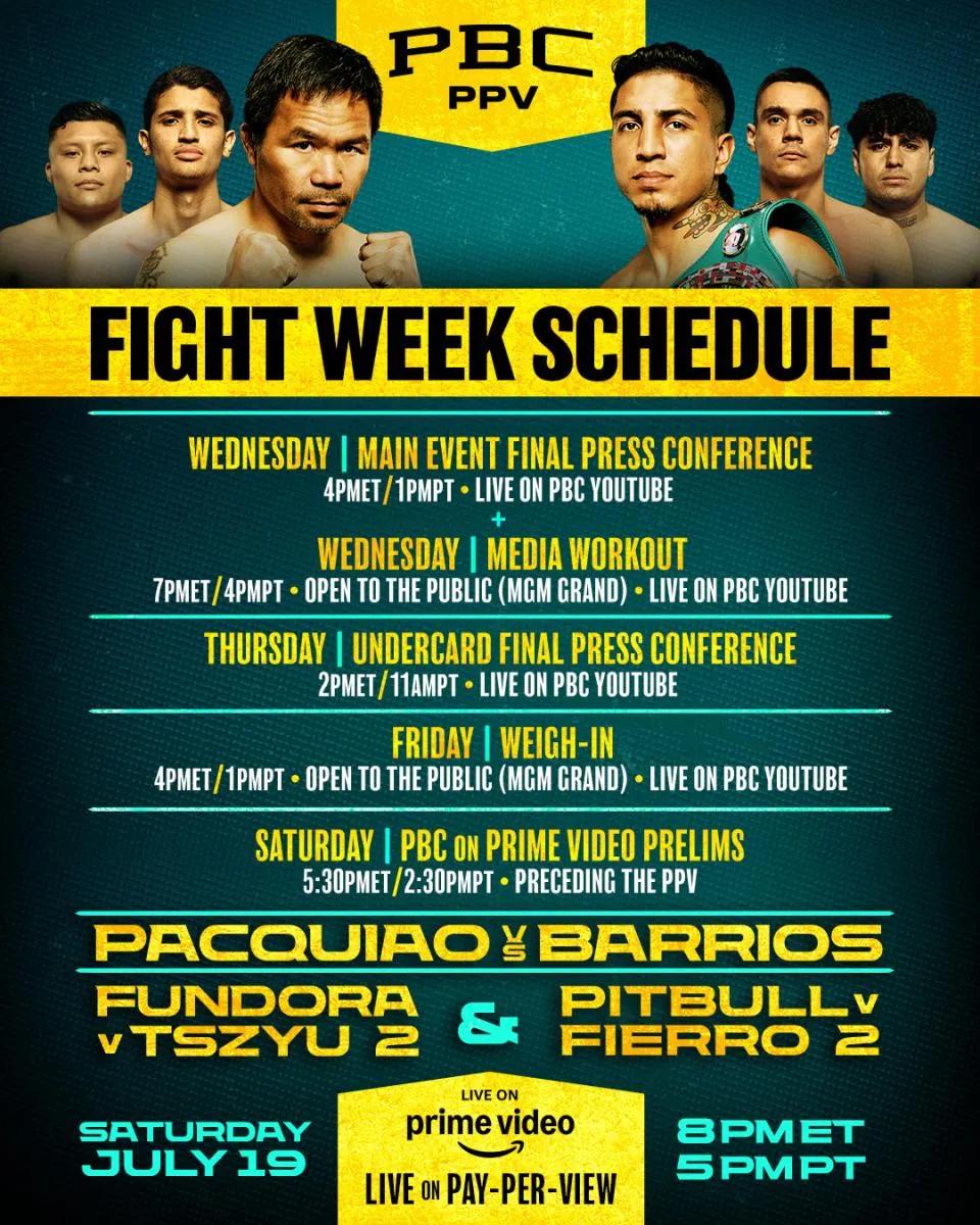 El evento que traerá del retiro a Pacquiao se llevará a cabo el próximo sábado 19 de julio, desde el MGM Grand Garden Arena desde la ciudad de Las Vegas, Nevada, Estados Unidos.