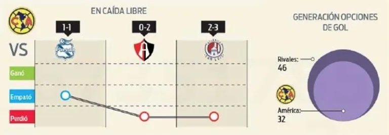 REALIDAD: Las Águilas pasaron de pelear el liderato a evitar ser último lugar, dejaron de ser una sólida defensiva que recibió 10 goles en 17 partidos, en apenas tres, ya le clavaron seis; de generar más opciones de gol que el rival a ser superado 30% (32 contra 46). Síntomas de que algo cambió radicalmente.
