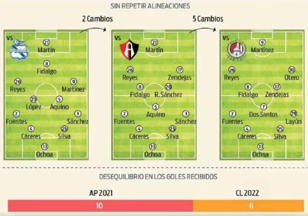 De los 22 jugadores registrados, sólo Bruno Valdez y Óscar Jiménez no han participado, más Chucho López que ya no está y dos jóvenes de la Sub 20. De hecho, no ha podido repetir alineación, de lo que mostró en la Jornada 1 ante Puebla, realizó dos modificaciones ante Atlas y cinco contra San Luis.