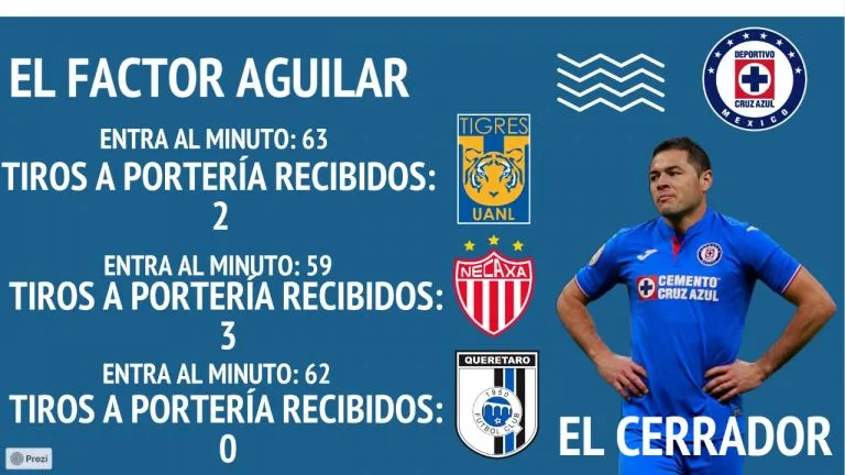 En los últimos tres partidos, el defensa central suma 86 minutos en el terreno, en ese tiempo Cruz Azul no ha recibido anotación y únicamente le han generado cinco opciones de gol. En conclusión, Aguilar entra y cierra la cortina para los celestes.