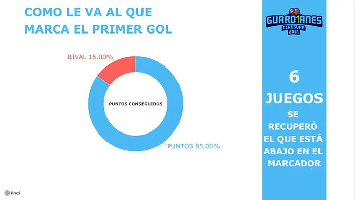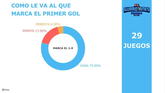 En 35 juegos que se han disputado hasta el momento en el Guard1anes 2021, hay seis que terminaron con empate a cero goles. En 29 se marcaron gol y el equipo que consiguió el primer tanto ganó en 23 ocasiones. Sólo en seis ocasiones dejó escapar unidades, con cinco empates y apenas Toluca, en la Jornada 1 fue capaz de remontar, fue ante los Gallos, perdía 1-0 y ganó 3-1.