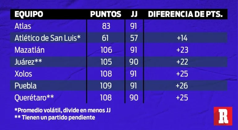 Faltan 10 fechas, 30 puntos por disputar y, siendo realistas, al único equipo que Atlas podría alcanzar y rebasar es al Atlético de San Luis, los otros cinco le sacan más de 20 puntos de ventaja, es prácticamente imposible que les dé alcance. ¿A qué aspira Atlas? La respuesta es simple: a ahorrarse 50 millones de pesos, pagar 70 en lugar de 120.