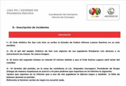 El reporte oficial del comisario que se entrega a la FMF, en su descripción de incidentes y en el punto 4 dice a la letra lo siguiente: "Al término del partido, en la zona de vestidores, el Lic. Presidente de Grupo Orlegi (sic) de manera respetuosa se acercó a mí para pedirme que reportara en mi informe lo siguiente: 'quiero que reportes en tu informe que a uno de mis jugadores le dijeron negro y también la falta de balones durante el partido'. Referente al termino racista de negro NO escuché nada". Así, de manera textual, está el reporte oficial del comisario que aparece en el video.