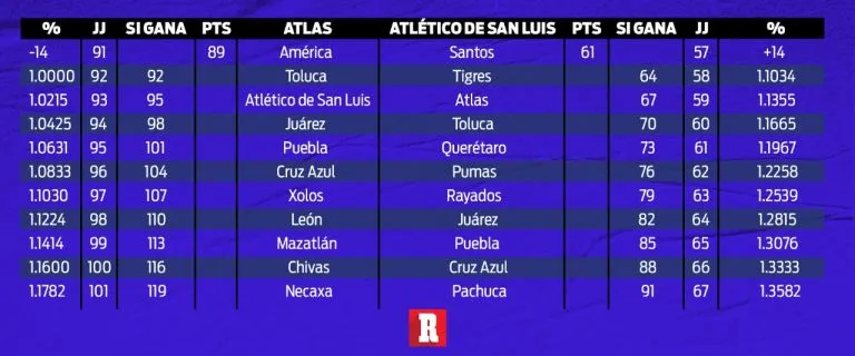 El número mágico, matemático, que haría que fueran inalcanzables para el Atlas sería obtener 18 de los 30 puntos por disputar, lo que luce complicado, porque si eso sucediera, aunque los de Diego Cocca ganaran los diez partidos, quedaría irremediablemente en último en la porcentual por 9 milésimas.