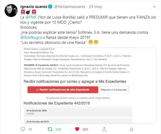 Tampoco ha llegado la respuesta de Doña Fede a la pregunta abierta que fijé en Twitter sobre cuál era la opinión entonces sobre la demanda interpuesta por la aseguradora Sofimex S.A. en el juzgado tercero de lo civil desde el 9 de mayo del 2019 con el número de expediente 442/2019 contra Fidel Kuri Grajales, su hijo y la empresa dueña del certificado de afiliación del Veracruz. ¿No que solo era cuestión de preguntar, Yon?.