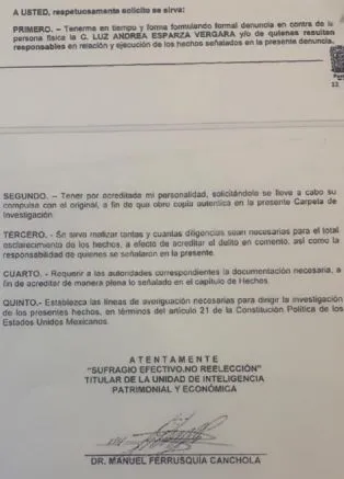 Doce días después de esa conversación, los 'supuestos', el 'beneficio de la duda' se hicieron añicos. Tenemos en nuestro poder la denuncia con el Folio UIPE 0001/2020 de la Unidad de Inteligencia Patrimonial y Económica de la Secretaría de Planeación y Finanzas de Puebla en contra de Luz Andrea Esparza Vergara, la hija del rector de la BUAP. ¿De qué la acusan?, de operaciones con recursos de procedencia ilícita. Se confirmó entonces lo que nos aseguraban en mails y las conversaciones.