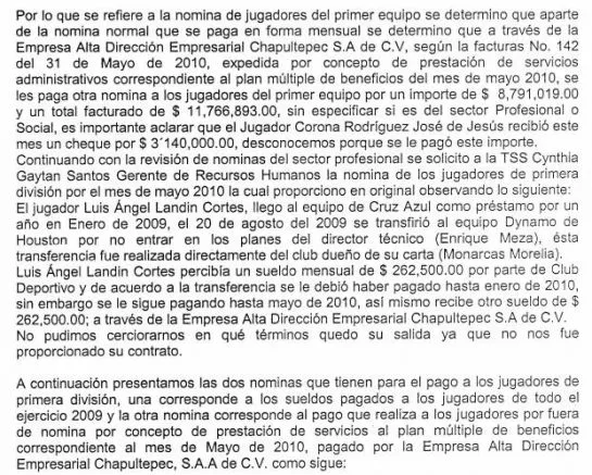 En su reporte, el despacho fiscal detectó que aparte de la nómina NORMAL (sic) del equipo que se pagaba en forma mensual, existía otro pago realizado a través de la empresa Alta Dirección Empresarial S.A. de C.V., donde se pagaba otra nómina a los jugadores del primer equipo.
