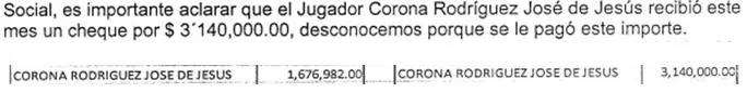 Volviendo a la auditoría del despacho Sánchez Barbosa sobre el equipo, a este le llamo sobre manera un detalle; un pago millonario, en una sola exhibición, en mayo del 2009 a uno de los integrantes, y dice a la letra: “es importante aclarar que el jugador Corona Rodríguez José de Jesús recibió este mes un cheque por tres millones 140 mil pesos, desconocemos porqué se le pagó ese importe". Cabe destacar que en la nómina 'normal' del equipo, en el 2009 el arquero fue reportado con un ingreso de un millón 676 mil pesos. Es decir en aquel año obtuvo casi cinco millones de ingresos.