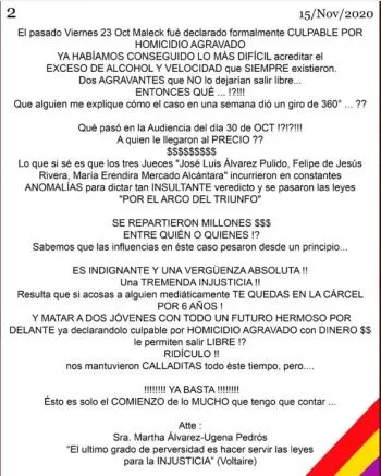 De esta historia hay muchos capítulos obscuros por escribir. En una próxima entrega hablaremos de la investigación puntual y seguimiento del caso que ha hecho de manera extraordinaria nuestra colega Elsa Martha Gutiérrez. También del factor que jugó o no en la decisión de la magistrada Rosario González Jiménez, madre del abogado Alberto García González, defensor de Maleck, y otros testimonios muy importantes que darán al fin la cara.
