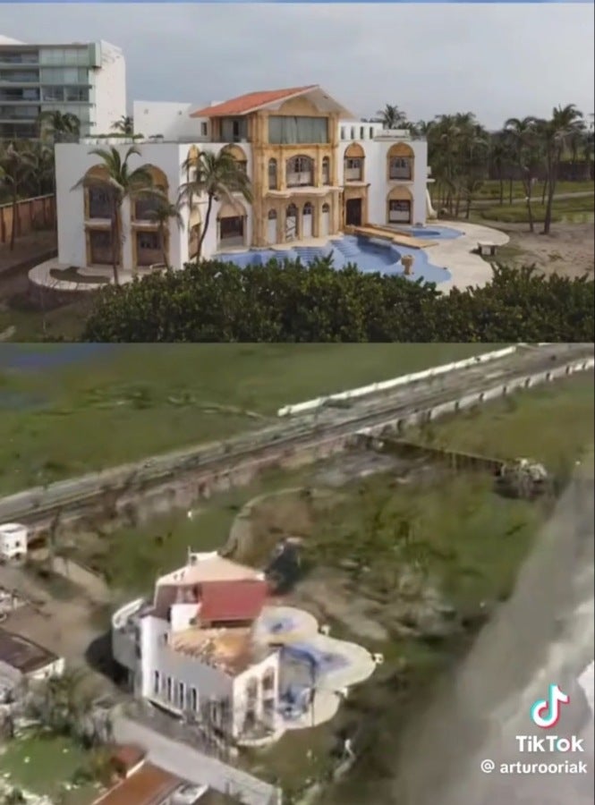 Sin embargo, tras el impacto del ciclón, el video compartido en redes sociales muestra que algunas de las palmeras que adornaban la propiedad cayeron. La alberca quedó cubierta de trozos de madera y otros objetos arrastrados por las fuertes ráfagas de viento. Se observa también que las ventanas de la residencia se rompieron y que en la terraza se encuentran objetos rotos.