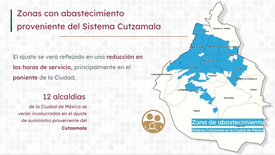 Al respecto, el coordinador general del Sistema de Aguas de la Ciudad de México (Sacmex), Rafael Carmona, mencionó que las únicas alcaldías que no se verán afectadas por la disminución del caudal serán Xochimilco, Milpa Alta, Tláhuac y Gustavo A. Madero, ya que son las únicas que cuentan con su propia fuente de abastecimiento ajeno al sistema Lerma.