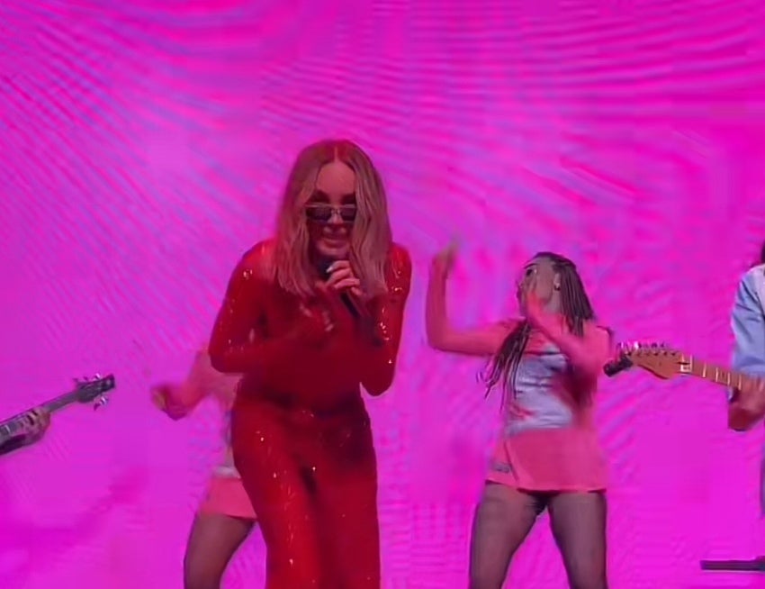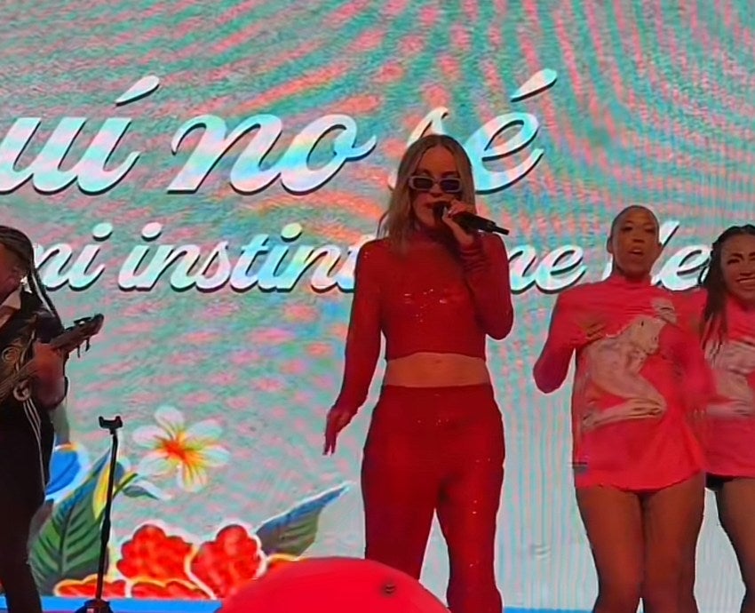 Vestida con un conjunto rojo y gafas negras, Beli aventó una pelota roja que apareció en el escenario, sin anticipar que terminaría golpeando accidentalmente a un asistente y lanzando su móvil.