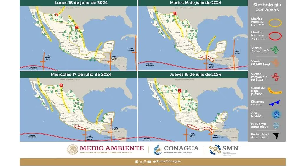 Lluvias de gran intensidad (50 a 75 mm) se esperan en los estados de Sonora, Chihuahua, Coahuila, Durango, Sinaloa, Nayarit, Jalisco, Michoacán, Guerrero, Oaxaca, Chiapas y Estado de México.