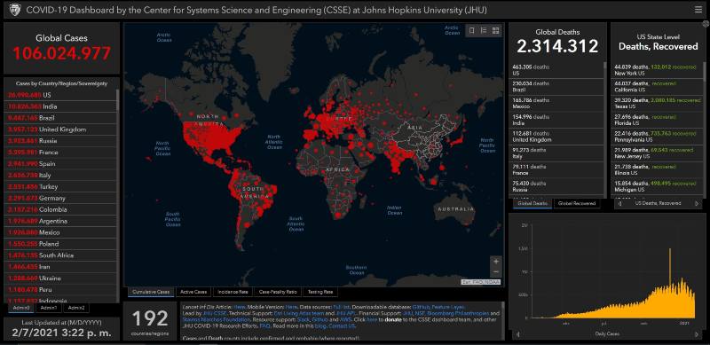 La cifra de infectados de Covid-19 en el mundo superó los 100 millones, al registrar un total de 106 millones 24 mil 977 contagiados; mientras que el número de fallecimientos en todo el orbe a causa de esta enfermedad rebasó los dos millones, al registrar dos millones 314 mil 312, de ellos, 461 mil 305 se han dado en Estados Unidos.