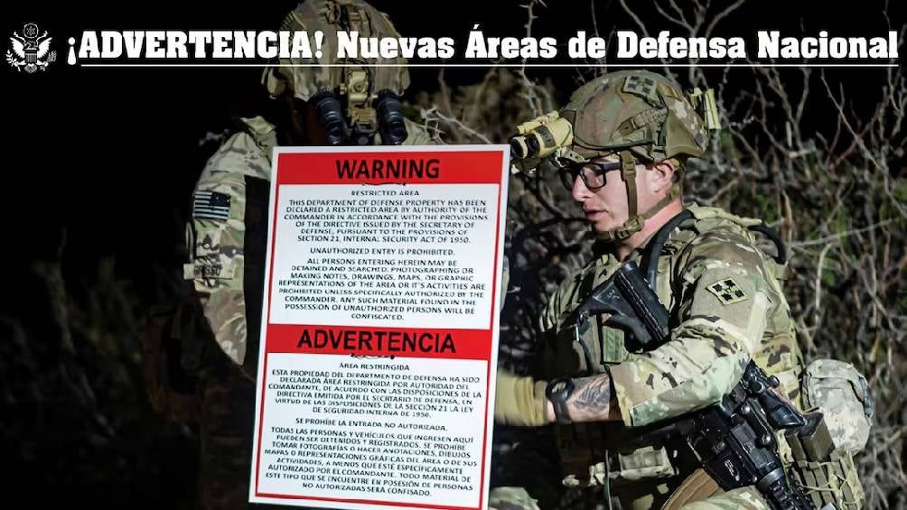 El gobierno de Estados Unidos, bajo la administración del presidente Donald Trump, ha designado ciertas zonas de la frontera sur con México como Áreas de Defensa Nacional (NDA, por sus siglas en inglés). Estas áreas son consideradas extensiones de bases militares estadounidenses, y cualquier persona no autorizada que ingrese será objeto de multa, arresto, enjuiciamiento y encarcelamiento.