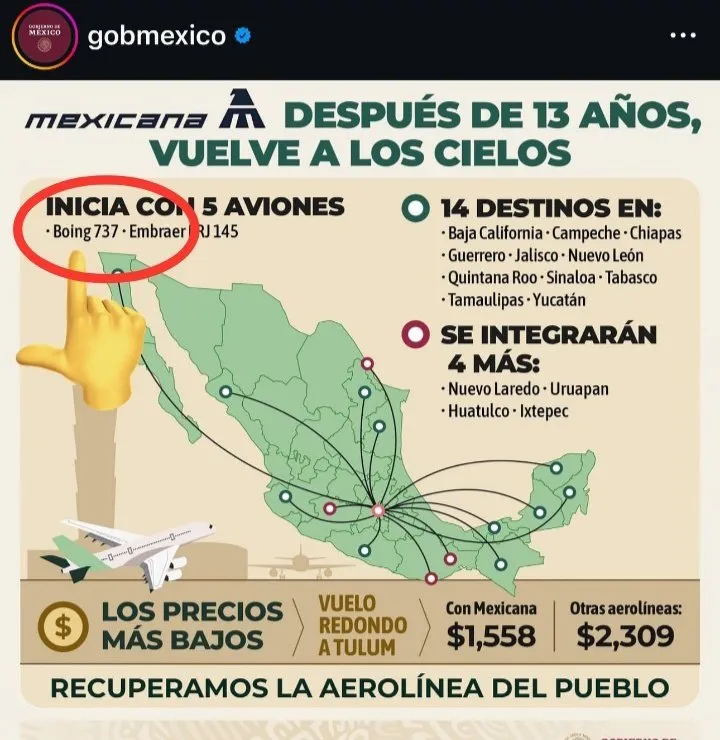 El Gobierno de México compartió imágenes, videos e infografías para destacar el retorno de Mexicana de Aviación, no obstante, un error tipográfico en la infografía que causó que cientos de usuarios compartieran varios memes sobre la presencia de aviones de la Cooperativa Pascual Boing en la flota.