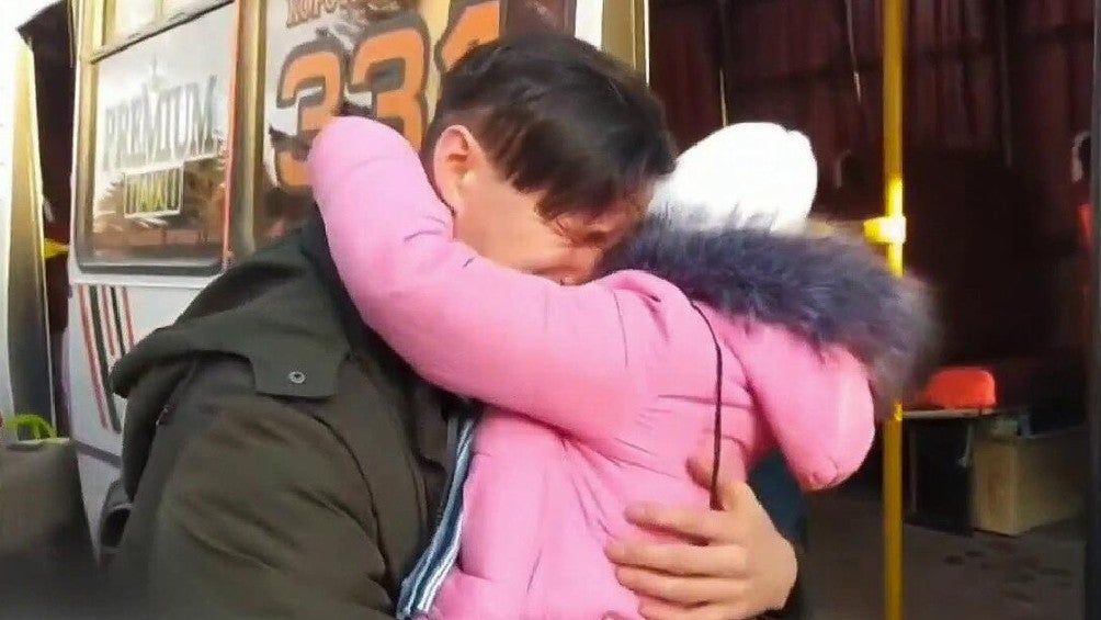 Padre de familia en Ucrania se ve obligado a despedirse de su hija y familia por la invasión de Rusia a dicho territorio. El conflicto bélico entre ambos países orilló a ciertos sectores de la población ucraniana a abandonar el país, ocasionando la separación de muchas familias.