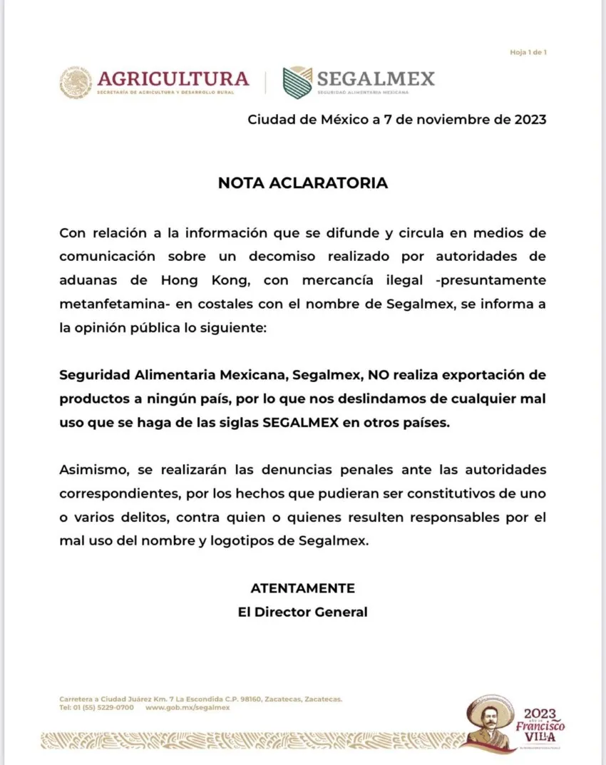 El cargamento en cuestión, que supuestamente consistía en conchas de caracol, estaba empacado en sacos de maíz y frijol con el logotipo de Seguridad Alimentaria Mexicana (Segalmex), que llevaba la leyenda "Gobierno de México" y el escudo nacional.