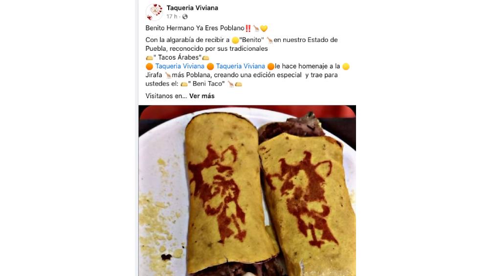 La "Taquería Viviana" en Puebla creó un taco árabe llamado 'Benitaco' en honor a la jirafa Benito. Las hermanas Kony y Viviana Aguayo abrieron la taquería para apoyar a mujeres solteras y embarazadas que enfrentan discriminación en el trabajo. La taquería impulsa el trabajo femenino a través de la comida mexicana con creatividad e ingenio.