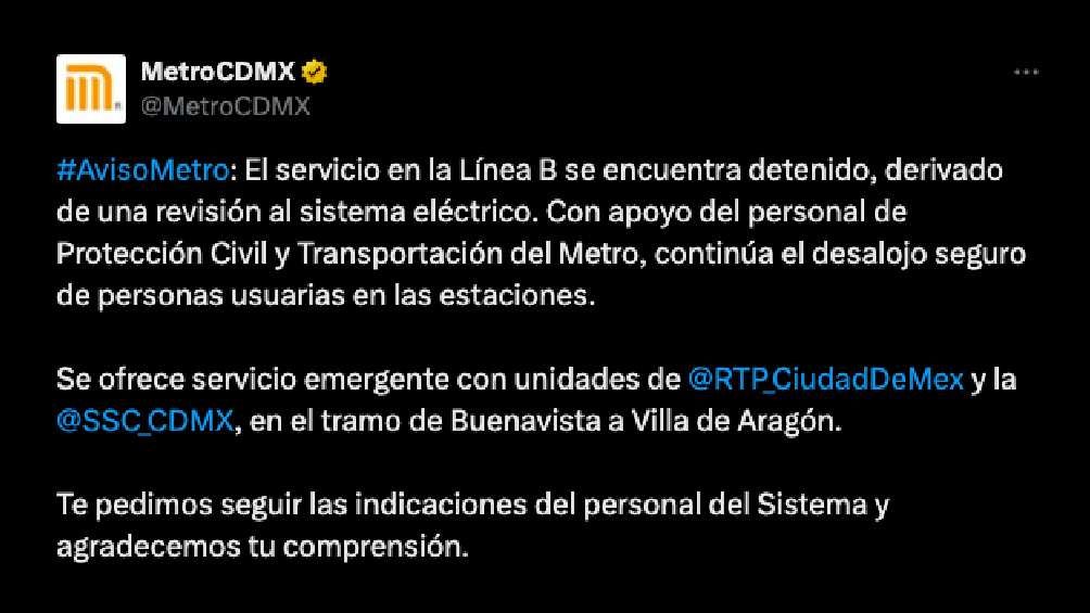“Debido a la revisión del sistema eléctrico, el servicio en la Línea B se encuentra detenido de manera momentánea, personal del sistema trabaja para restablecer a la brevedad. Atiende las indicaciones del personal del Sistema”.