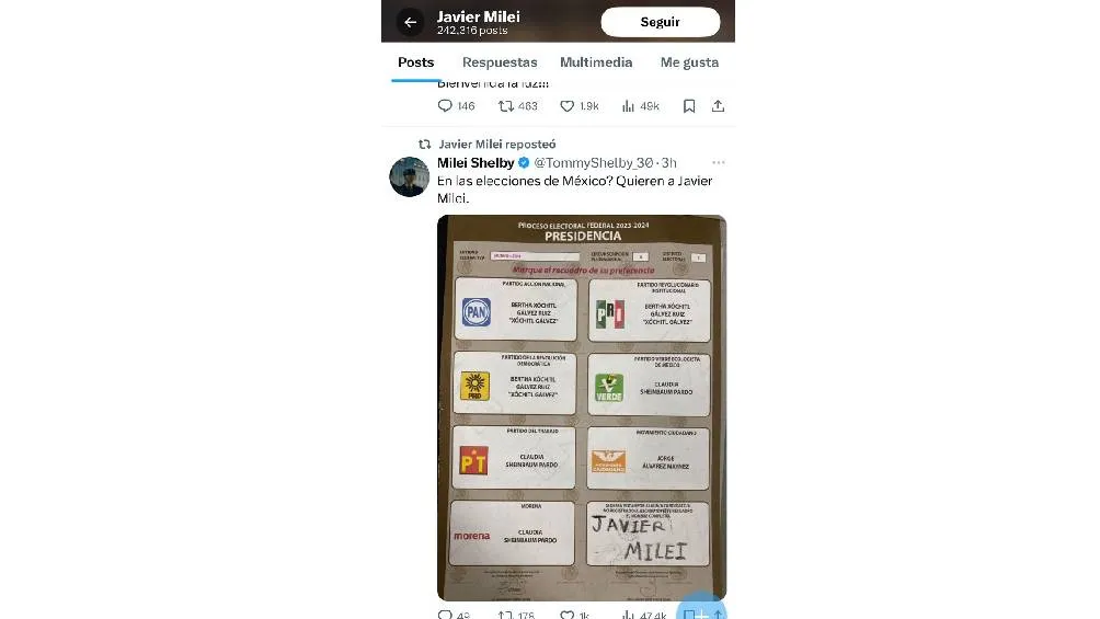 El presidente argentino compartió en su cuenta de X una imagen de un voto emitido para Javier Milei. El votante mexicano, Jesús Chávez, expresó que era la primera vez que votaba por alguien que realmente lo representaba como presidente.