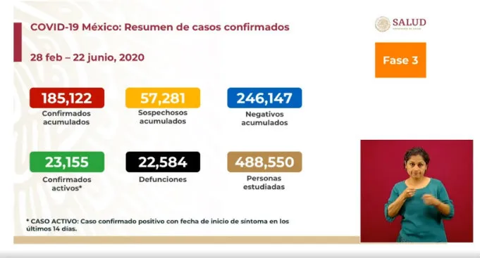 La Secretaria de Salud informó este lunes 22 de junio en la conferencia de prensa diaria que los casos de positivos de Covid-19 en México llegaron a la cifra de 185 mil 122, lo que representa un aumento de 4 mil 577 infectados en un solo día.