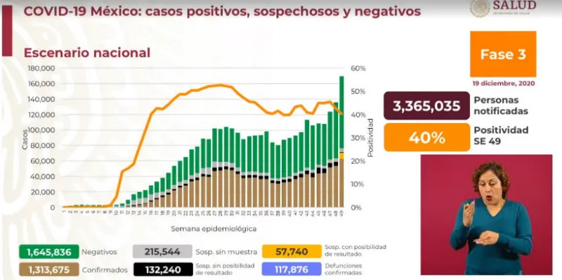 La Secretaría de Salud informó este sábado 19 de diciembre en su conferencia de prensa diaria, que los casos de positivos de Covid-19 confirmados en México llegaron a la cifra de un millón 313 mil 675 infectados, lo que representa un aumento de 12 mil 129 contagios en el último día.