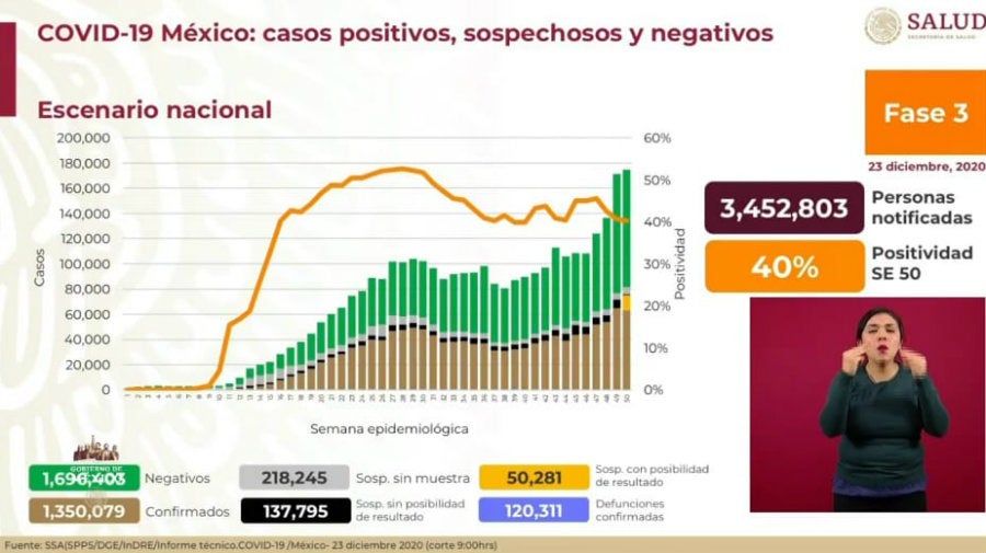 La Secretaría de Salud informó este miércoles 23 de diciembre en su conferencia de prensa diaria, que los casos de positivos de Covid-19 confirmados en México llegaron a la cifra de un millón 350 mil 79 infectados, lo que representa un aumento de 11 mil 653 contagios en el último día.