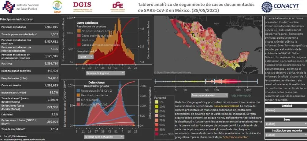La Secretaría de Salud informó este martes 25 de mayo en su conferencia de prensa diaria, que los casos positivos de Covid-19 confirmados en México llegaron a la cifra de 2 millones 399 mil 790 infectados, un aumento de 2 mil 483 contagios en el último día.